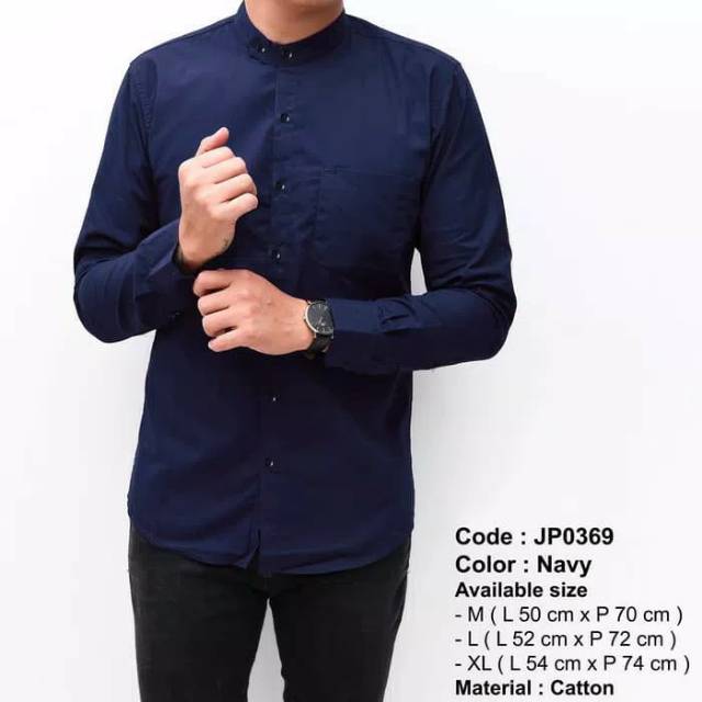 Kemeja Pria Cowok Lengan Panjang Biru Navy Kerah Shanghai Polos Model Baju Koko Sanghai Slimfit